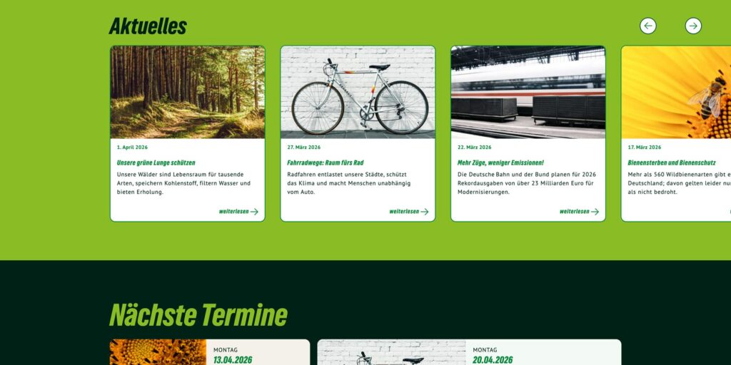 Auf der Demoseite siehst Du das Theme mit Musterinhalten wie sie z.B. ein grüner Kreis- oder Ortsverband nutzen könnte. Auch für Kandidierende ist das Theme geeignet.