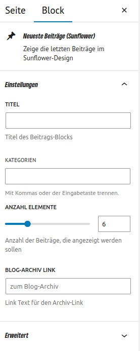 Das Sunflower Theme liefert einige eigene Blöcke mit sich. Unter anderem den Neueste Beiträge (Sunflower) Block. Dort kannst du ein paar Einstellungen vornehmen.