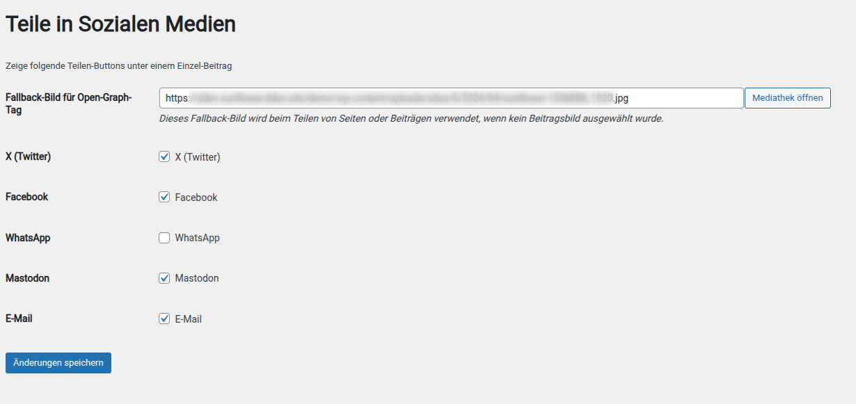 Du kannst auch einfach die URL des Beitrags kopieren und ihn im Netzwerk Deiner Wahl posten. Meist versucht das Netzwerk, das Beitragsbild er holen um den Post attraktiver zu machen. Hast Du kein Beitragsbild vergeben, kannst Du ein Standard-Bild für solche Fälle festlegen. Ansonsten wählt das Sunflower ein Bild für Dich aus.