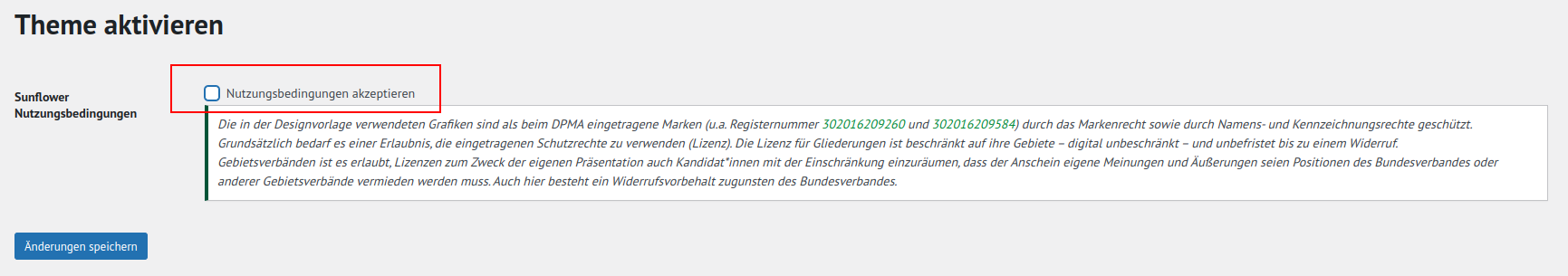 Um die Sonnenblume als Logo und Icon nutzen zu können, musst Du Dir die Nutzungsbedingungen durchlesen und akzeptieren. Andernfalls wird die Sonnenblume nicht angezeigt. Du kannst das Theme trotzdem nutzen und Dein eigenes Logo verwenden.