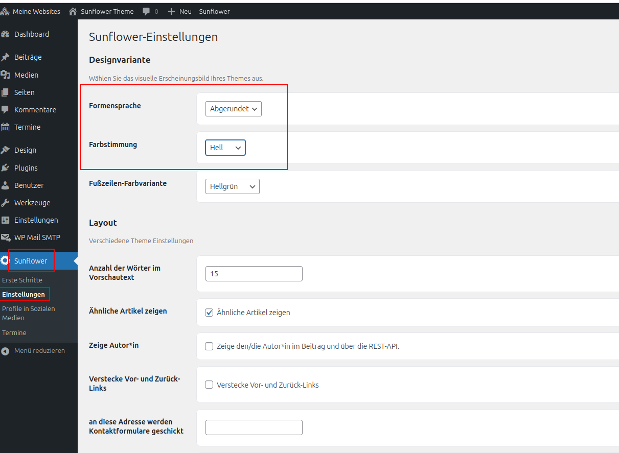 Nach der Installation des Themes musst Du einige Einstellungen vornehmen. Dafür findest Du im Dashboard einen Menü-Punkt "Sunflower":
