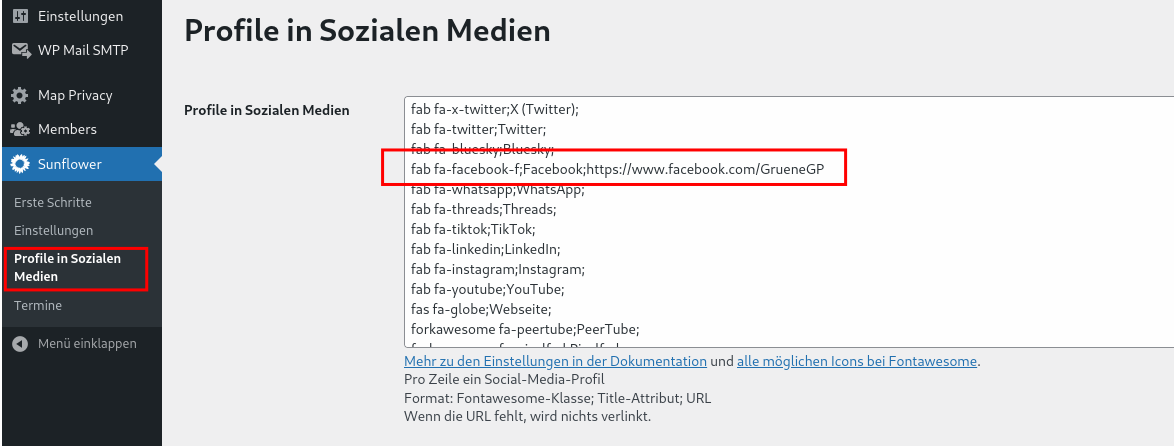 Du kannst beliebige Social-Media-Profile in beliebiger Reihenfolge in der Fußzeile der Webseite anzeigen. Unterhalb von "Sunflower" und "Profile in Sozialen Medien" findest Du schon eine vorgefertigte Liste, die nur noch mit der URL Deines Social-Media-Profiles ergänzt werden muss.