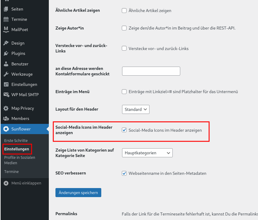 Sunflower -> Einstellungen -> Social-Media Icons im Header anzeigen